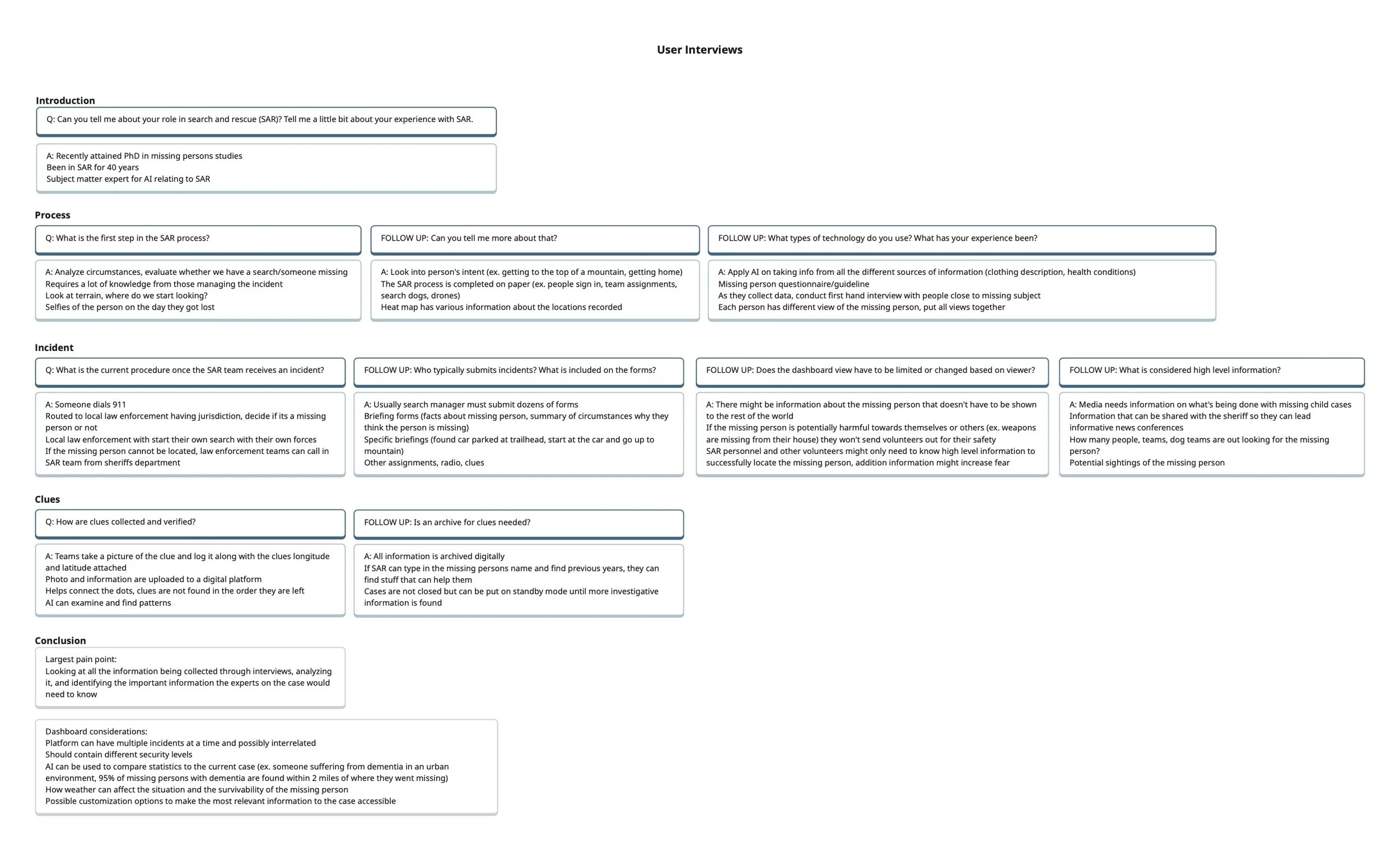 Through interviews with SAR professionals, I identified major pain points including time-consuming data entry, inconsistent record organization, and difficulty finding relevant case details under pressure. Market analysis revealed no comprehensive digital tool that integrated all aspects of the SAR process — highlighting Iter8’s unique potential.